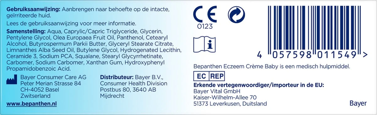 Bepanthen Eczeem Crème Baby kan naar behoefte meerdere keren per dag worden aangebracht op de geïrriteerde niet beschadigde huid. Bepanthen Eczeem Crème Baby is een medisch hulpmiddel. Lees de gebruiksaanwijzing voor meer informatie.*Bepanthen bevat dexpanthenol. Deze stof heeft de bekende eigenschap het huidherstel te ondersteunen.