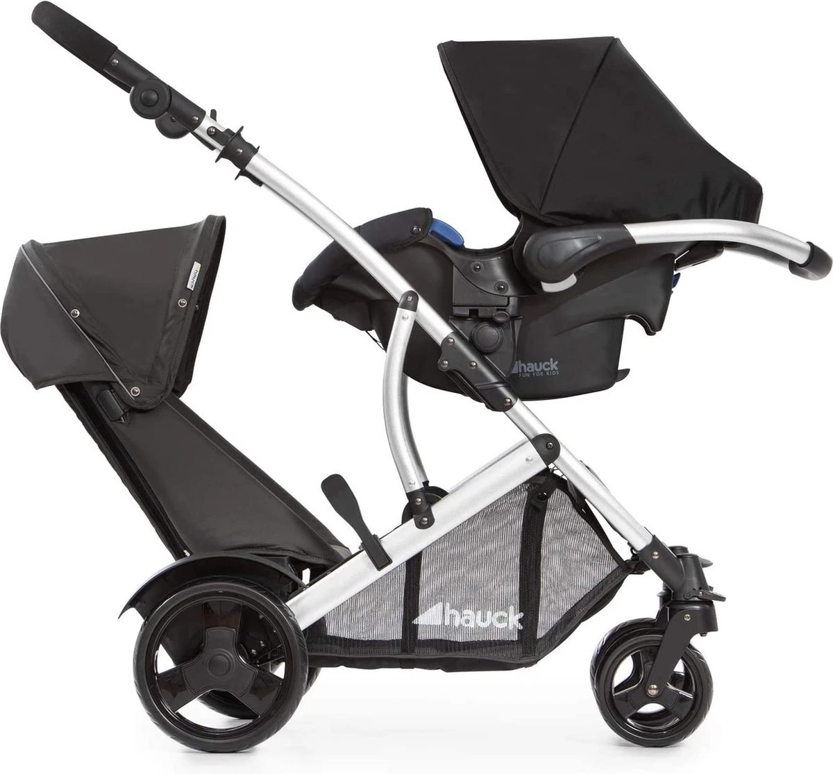 Grote broers en zussen kunnen in de onderste stoel zitten. Wielbeschermers op de achterwielen voorkomen dat kinderen de spaken raken. En als je met slechts één kind uitgaat, kan de stoel in enkele seconden worden verwijderd.