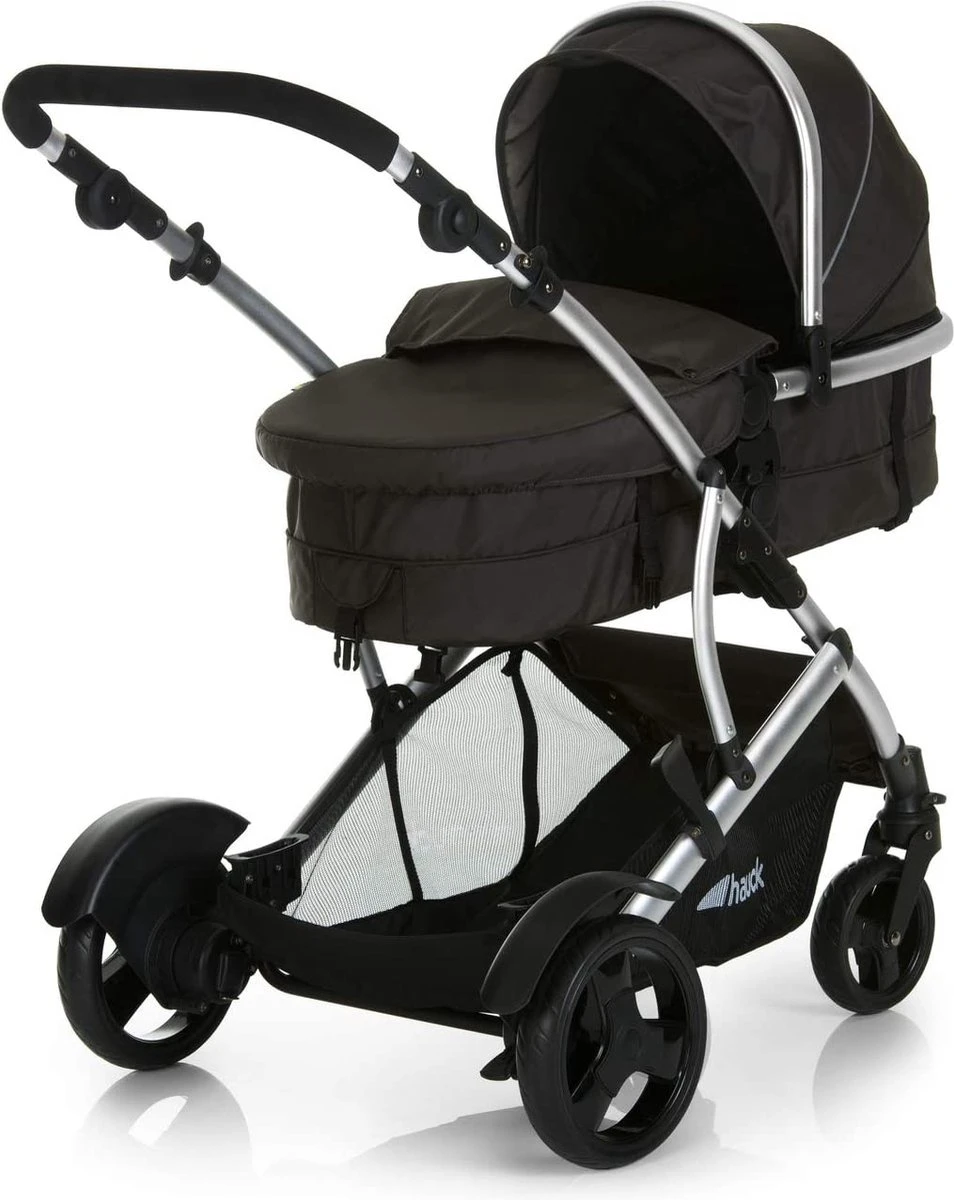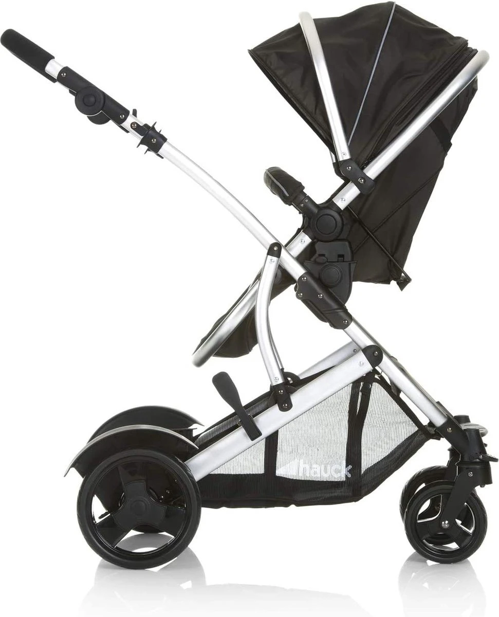 Door het lichte aluminium frame, de vering en de draaibare en vergrendelbare voorwielen is deze kinderwagen zowel in de stad als op het land zeer eenvoudig te schuiven.