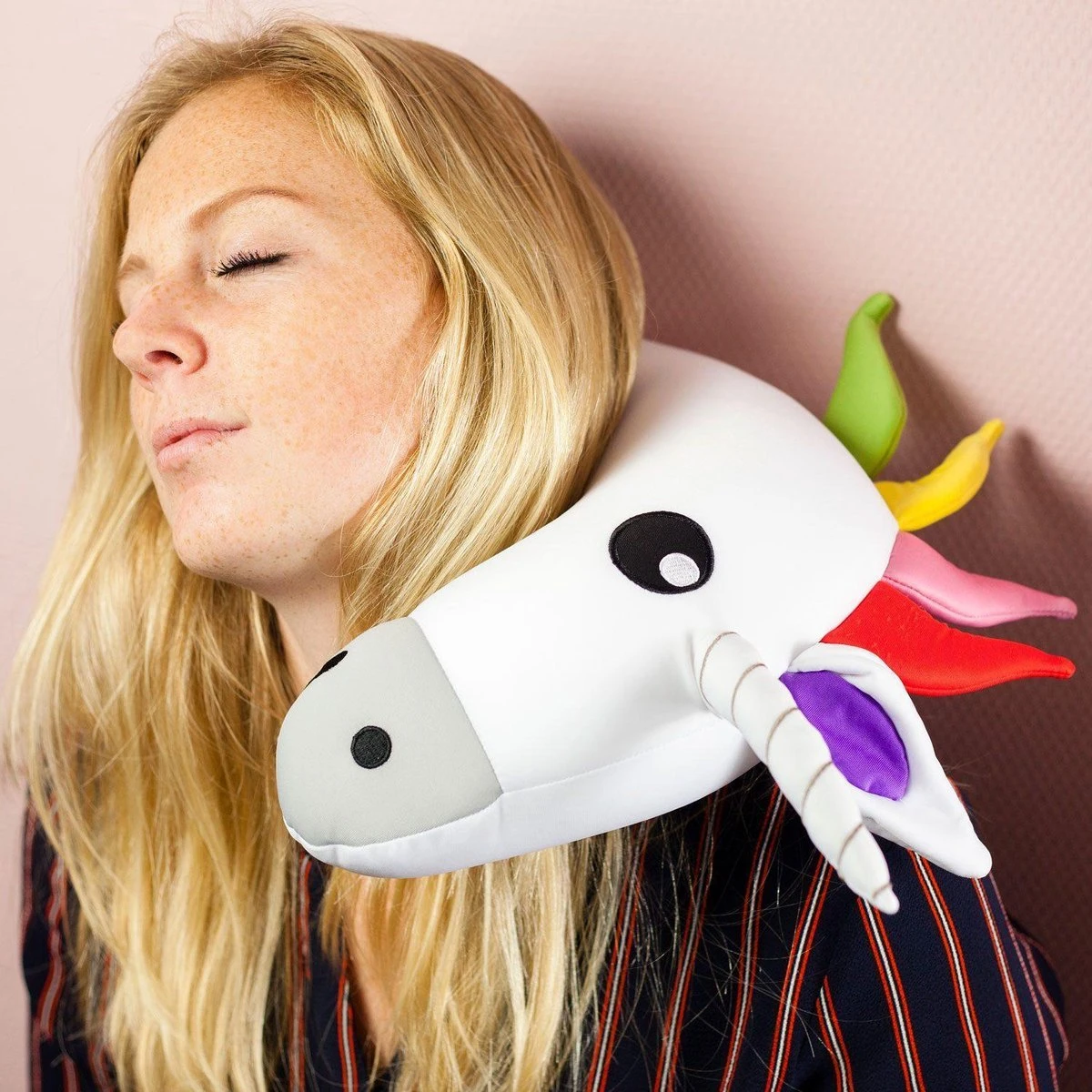 Eenhoorn nekkussen van Bitten. Reiskussen voor in het vliegtuig, de auto of in de bus. Nekkussen in de vorm van een unicorn. Het eenhoorn nekkussen is wit met gekleurde manen. Houd nek en hoofd op zijn plaats tijdens het slapen onderweg. Gemaakt van zacht materiaal. Het unicorn reiskussen heeft een clip om aan de bagage vast te maken. Afmeting: 35 x 35 x 10 centimeter.