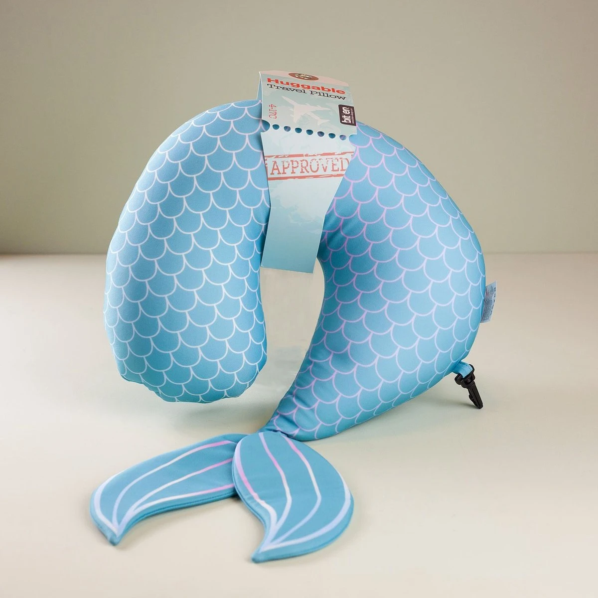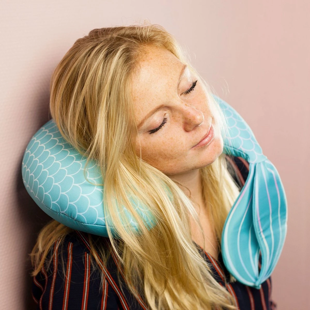 Zeemeermin nekkussen van Bitten. Reiskussen in de vorm van een zeemeerminstaart. Kleur: blauw. Comfortabel nekkussen in de vorm van een zeemeerminstaart voor op reis. Ideaal voor lange reizen in het vliegtuig, de trein, de bus of tijdens een lange autorit. Zonder pijn in de nek wakker worden na een dutje onderweg. Met handige clip om het reiskussen aan bagage vast te maken. Kan ook makkelijk om het uittrekbare handvat van een trolley gehangen worden. Afmeting: 35 x 35 x 10 centimeter.