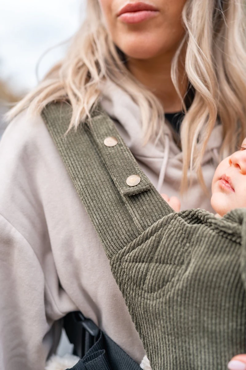 De babydrager wordt geleverd inclusief bevestigingsband om je grotere baby op de rug te dragen of om het rugpand te versmallen voor de allerkleinsten. De banden zijn netjes weg te werken door middel van de elastiekjes aan de uiteinden.