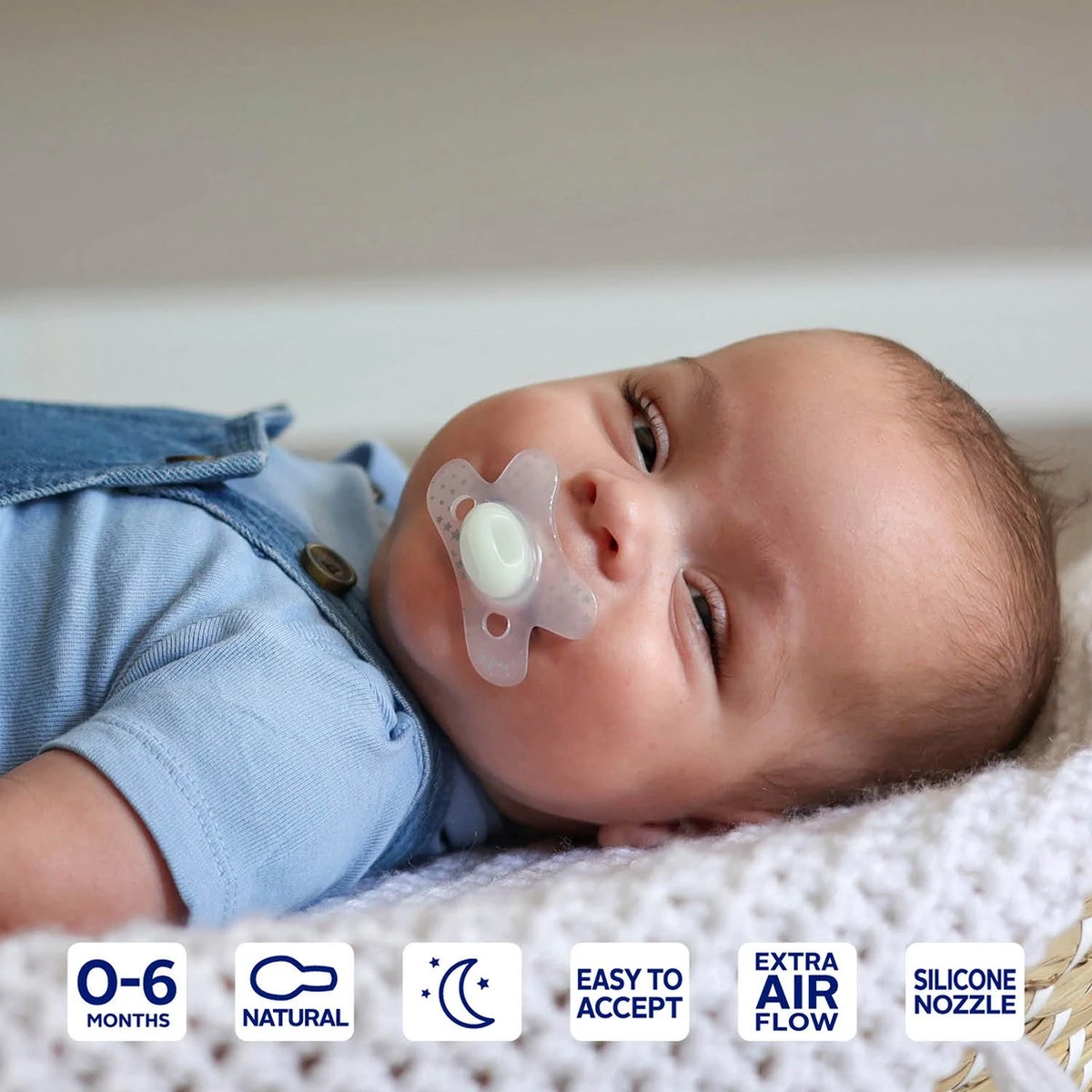 De 0-6 maanden Natural Difrax Glow in the Dark fopspeen is makkelijk terug te vinden in het donker. Leg de speen overdag in de zon en vind deze ’s nachts gemakkelijk terug in het bed van je kindje.