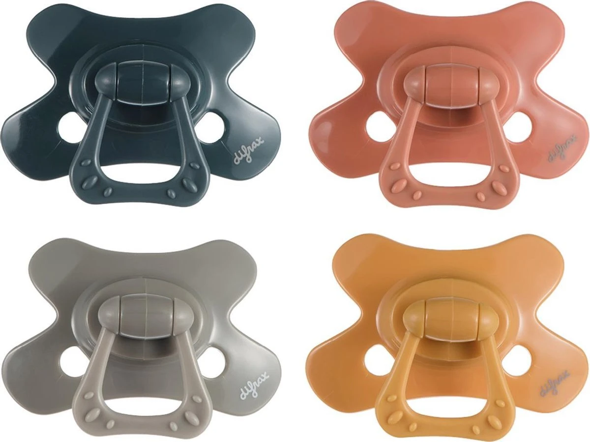 De donkerblauwe, grijze, roodbruine en gele 18+ Maanden Dental Difrax Pure fopspenen sluiten perfect aan op het gezichtje van je baby en voorzien in de natuurlijke zuigbehoefte, waardoor je kindje zich geborgen en kalm voelt.