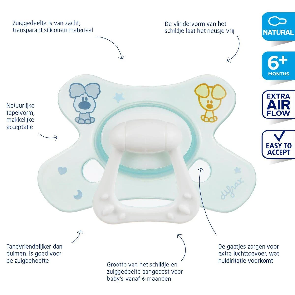 - Difrax fopspenen hebben een siliconen zuiggedeelte wat hygiënischer en veiliger is dan natuurrubber.
