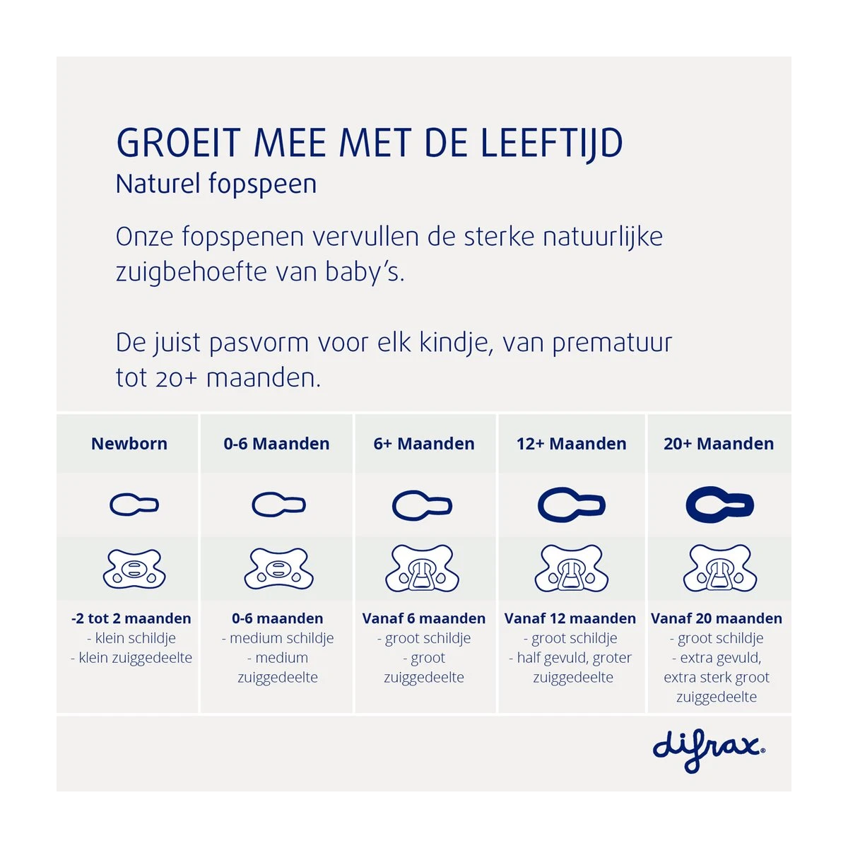 Difrax fopspenen zijn verkrijgbaar in 5 maten: Newborn, 0-6 maanden, 6+ maanden, 12+ maanden en 20+ maanden. De zuiggedeeltes en schildjes van onze fopspenen worden steeds een maatje groter en veranderen mee met de leeftijd van je kindje. Onze Newborn speentjes zijn ook te gebruiken voor premature baby’tjes.