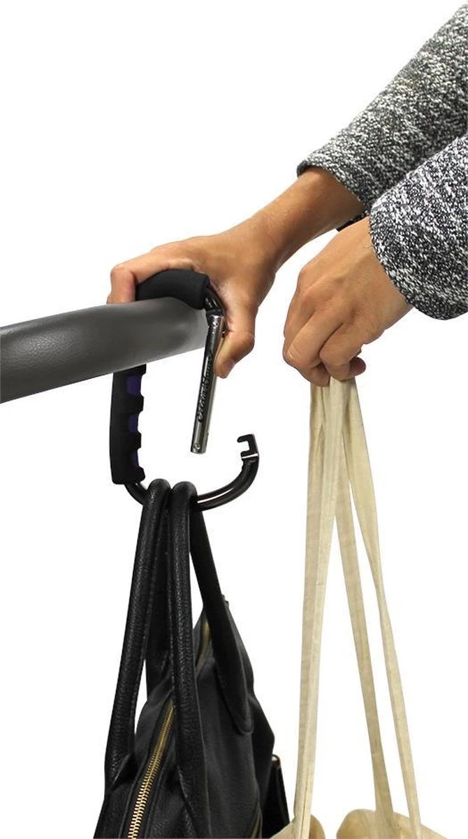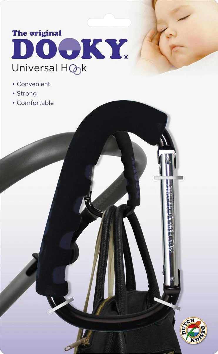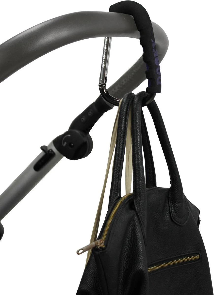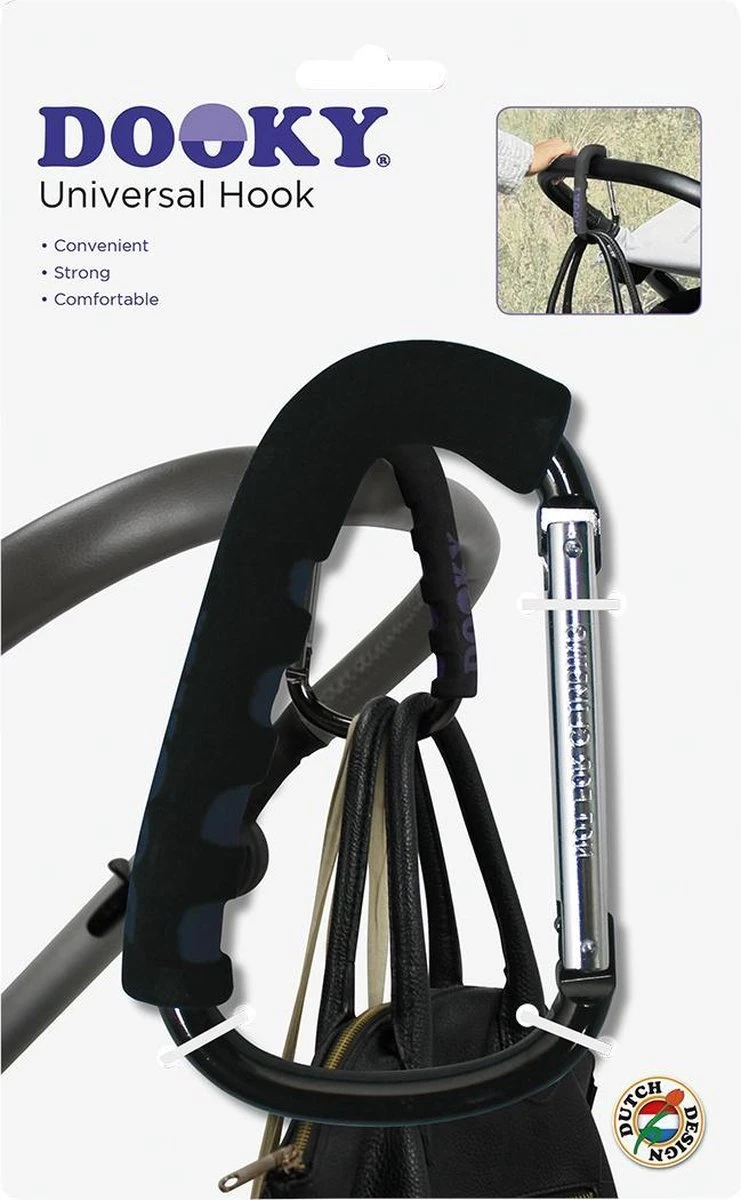 De Dooky Universele Haak is een “must have” voor iedere ouder. Altijd een plek om je (extra) tas aan te hangen. Klik de robuuste Dooky haak aan de stang van je kinderwagen en hang er alle tassen aan. Snijdende plastic tasjes in je hand is daardoor verleden tijd. De sterke metalen tassenhaak houdt meerdere tassen bij elkaar. De schuimrubberen antislip laag zorgt ervoor dat de haak niet weg glijdt en mooi op z’n plek blijft. En ligt het zachte schuimrubber fijn in de hand.