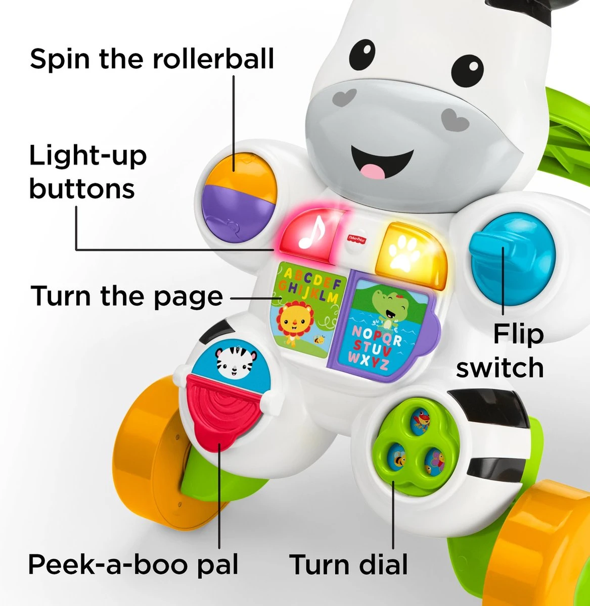 De Fisher-Price® Loop Met Mij Zebra leert je kind eerste woordjes en eerste stapjes – precies het vriendje dat je kind nodig heeft! Ronddraaien, kantelen, rollen, draaien. Deze zebra zit boordevol leuke activiteiten voor je baby. Je baby kan de bladzijde omslaan of op de oplichtende knopjes drukken om te luisteren naar meezingliedjes en zinnetjes over het alfabet en tellen, samen met nieuwe dierenvriendjes! En als baby leert lopen, houden de handgreep en het stevige onderstuk met 4 wielen je kleintje in balans bij de eerste wiebelige stapjes. “Ga door!” Met een heleboel leuke zinnetjes, muziekjes en liedjes die je kleintje stimuleren om te bewegen en zich te amuseren – dit speelgoed helpt je kleintje steviger op de voetjes te staan!