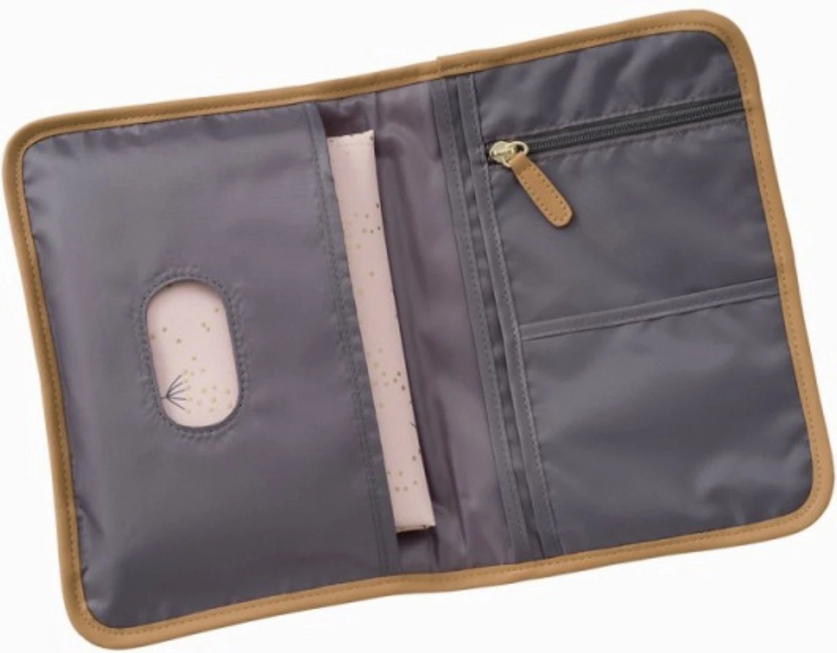 In dit praktische etui passen een pakje vochtige doekjes en er zit een waterafstotend verschoningsmatje bij. Het etui (dat eruitziet als een stijlvolle clutch) heeft een extra vakje met een rits. Een stevige elastiek houdt het etui dicht.