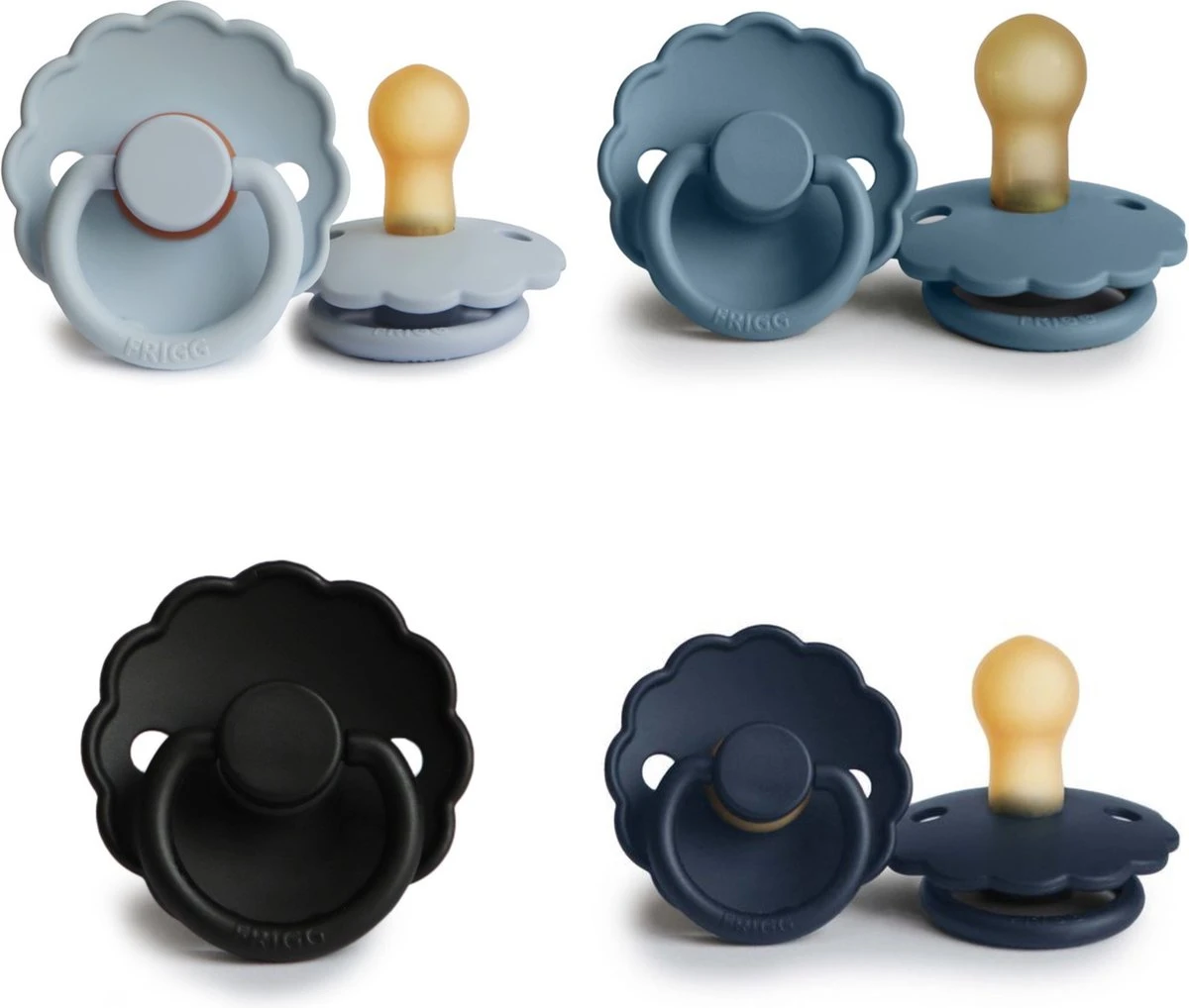 Deze set van 4 Daisy Frigg fopspenen bevat de kleuren: Glacier blue, Dark Navy, Powder blue, Jet black ! De Frigg fopspenen zijn voorzien van een uniek design en een comfortabele vorm. De Frigg fopspenen hebben twee luchtgaten in het schildje zitten, waardoor je kleintje altijd goed kan blijven doorademen. De Frigg speen is gemaakt van natuurrubber en het schildje is gemaakt van Polypropyleen. Berg de Frigg speen altijd vocht- en lichtvrij op en stel de spenen niet bloot aan direct zonlicht, dit kan de kwaliteit van de speen niet garanderen.