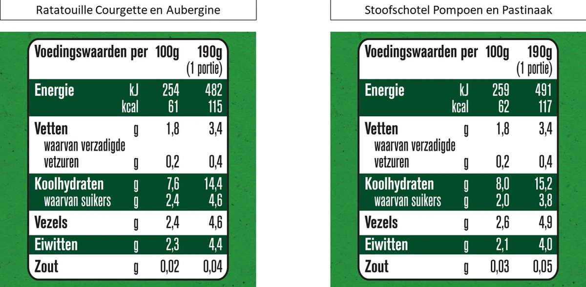 | Ingrediënten | Ingrediënten: water, courgette* 21,6%, witte bonen* 15%, aubergine* 12%, tomatenpuree* 6%, rode paprika* 4%, pasta (volkoren TARWEbloem, water)* 4%, olijfolie van eerste persing*, ui*, knoflookpuree*. Bevat mogelijk EIEREN. *afkomstig van biologische landbouw. Geen zout toegevoegd. Deze maaltijd is zorgvuldig samengesteld om te voldoen aan de eisen voor kwaliteit van eiwit voor baby's. Ingrediënten: water, pompoen* 18%, witte bonen* 15,5%, wortel* 13,9%, pastinaak* 10%, GERST* 4%, olijfolie van eerste persing*, kaneel*. Bevat mogelijk SELDERIJ. *afkomstig van biologische landbouw. Geen zout toegevoegd. Deze maaltijd is zorgvuldig samengesteld om te voldoen aan de eisen voor kwaliteit van eiwit voor baby's. |