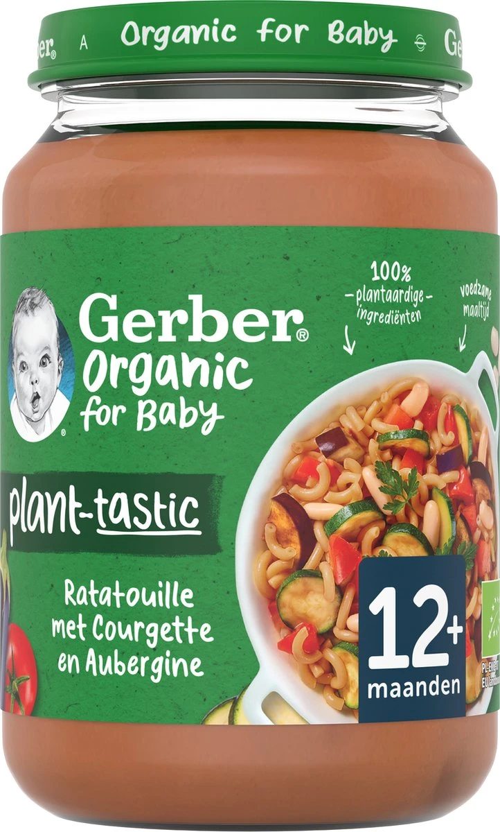 Gerber® Plant-tastic Variatiemenu 12+ maanden: 100% plantaardige maaltijden met een mix van biologische granen, groente en peulvruchten. In de smaken: Ratatouille met Courgette en Aubergine en Stoofschotel met Pompoen en Pastinaak. Speciaal afgestemd op de voedingsbehoefte van kindjes vanaf 12 maanden.