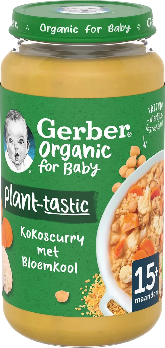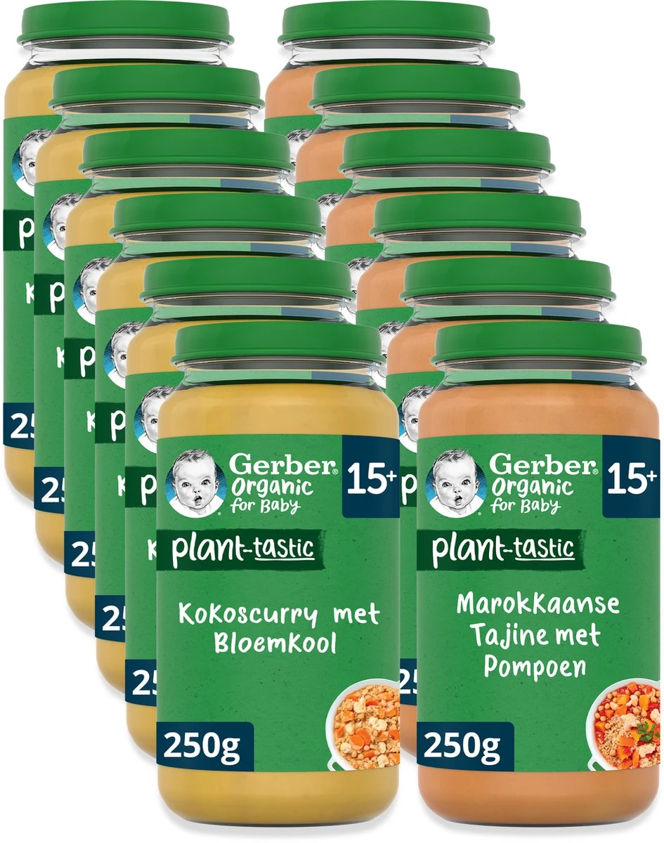 Gerber® Plant-tastic Variatiemenu 15+ maanden: 100% plantaardige maaltijden met een mix van biologische granen, groente en peulvruchten. In de smaken: Kokoscurry met Bloemkool en Marokkaanse Tajine met Pompoen. Speciaal afgestemd op de voedingsbehoefte van kindjes vanaf 15 maanden.