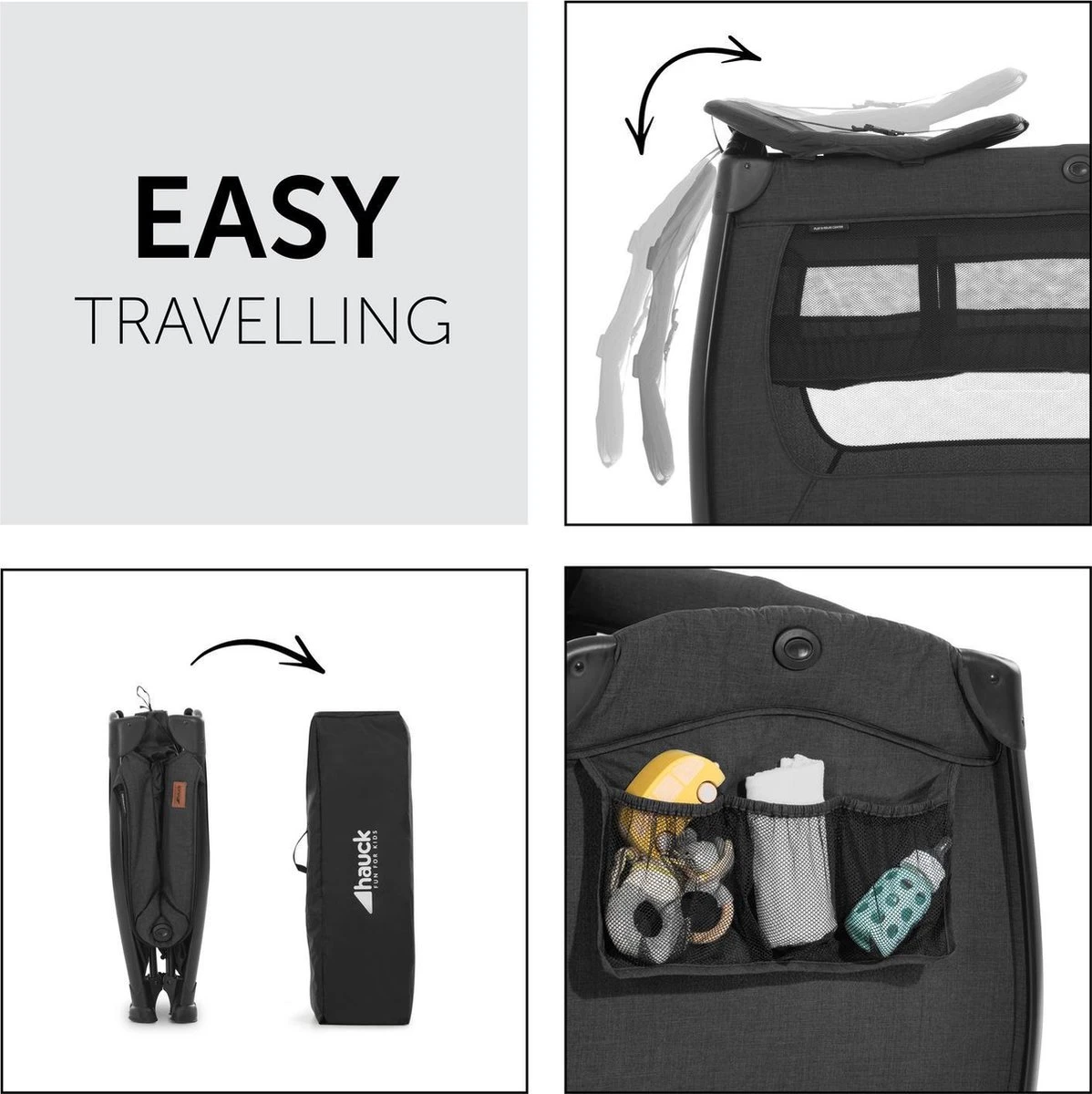 Door op de knoppen in het midden van alle vier de zijkanten te drukken, kan de montage en het opvouwen in een oogwenk worden gedaan. Compact opgevouwen berg je het reisbedje en accessoires eenvoudig op in de meegeleverde draagtas.