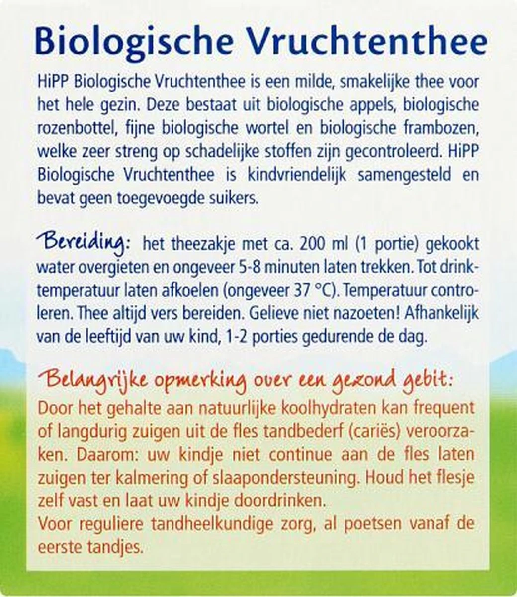 HiPP Biologische Vruchtenthee is een milde, smakelijke thee voor het hele gezin. Deze bestaat uit biologische appels, biologische rozenbottel, fijne biologische wortel en biologische frambozen, welke zeer streng op schadelijke stoffen zijn gecontroleerd. HiPP Biologische Vruchtenthee is kindvriendelijk samengesteld en bevat geen toegevoegde suikers.