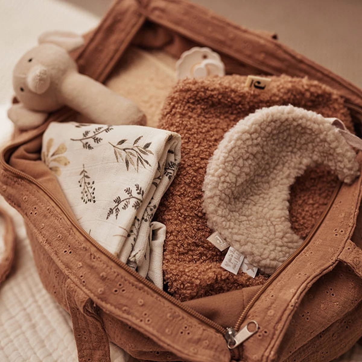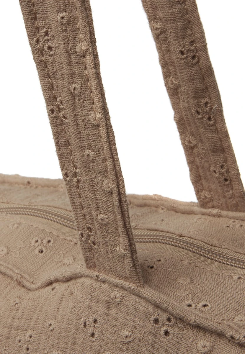 De tas is gemaakt van een zachte muslin stof in een heerlijk kleurtje, biscuit. De buitenkant van de tas heeft een lief embroidery werkje van bloemetjes in de stof en de binnenkant is gemaakt van polyester.