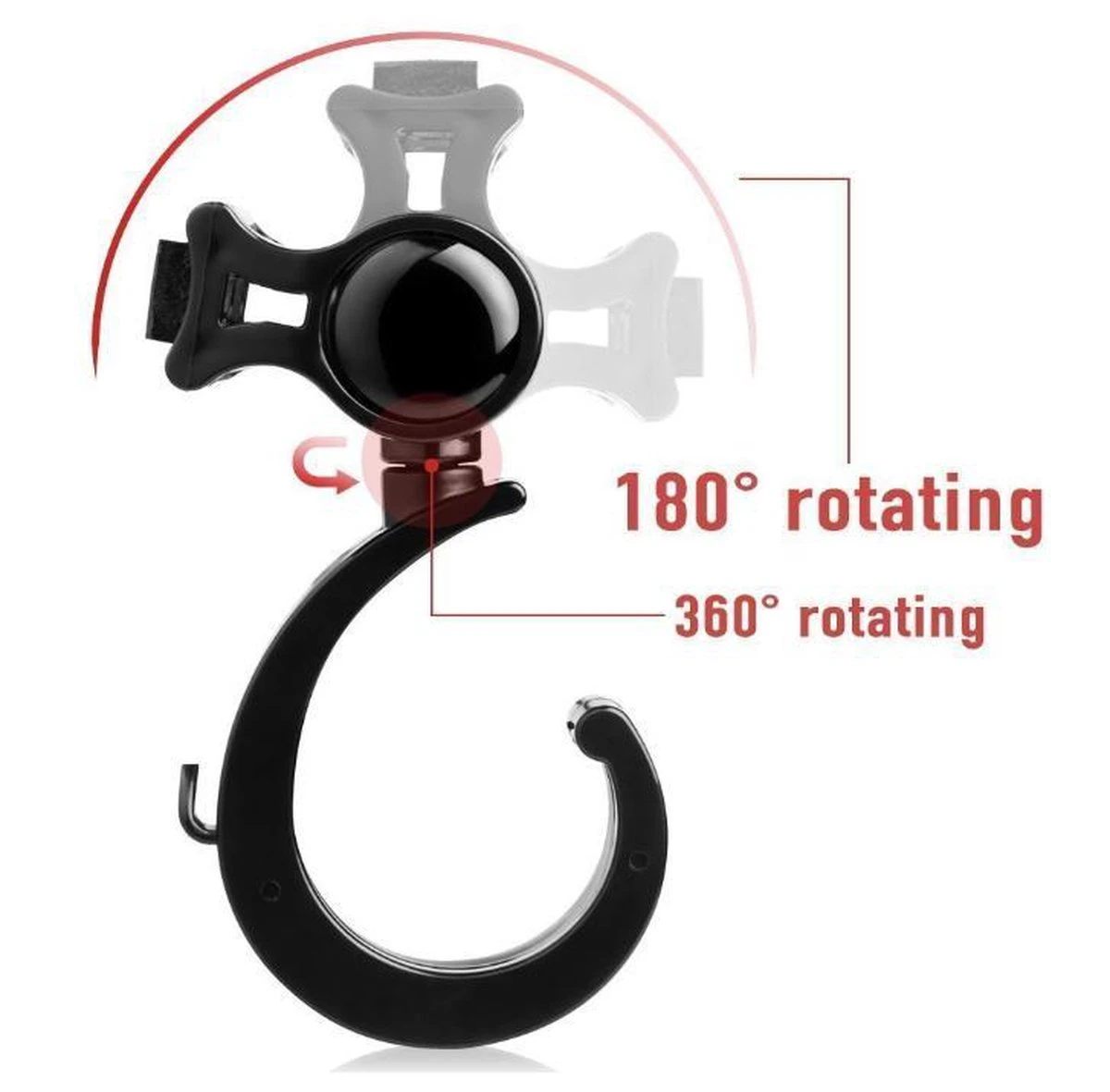 De wandelwagenhaken kunnen 360 graden worden gedraaid om aan de ophanghoek te voldoen voor extra gemak! Bevestig aan de achterkant van de hoofdsteun van een auto en transformeer hem in een geweldige kleding-, tas- of opslaghanger!