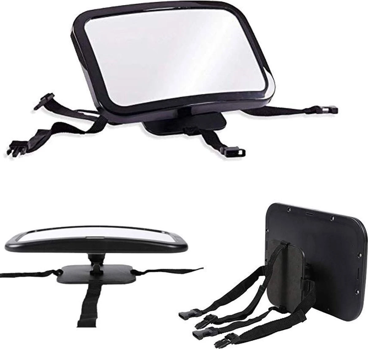 De spiegel is 360° wendbaar om de juiste hoek vast te stellen.Het spiegelglas is gemaakt van acryl en hoogwaardige ABS materiaal is getest en bewezen veilig. De spiegel is makkelijk te installeren door de twee verstelbare banden met klipsluitingen.