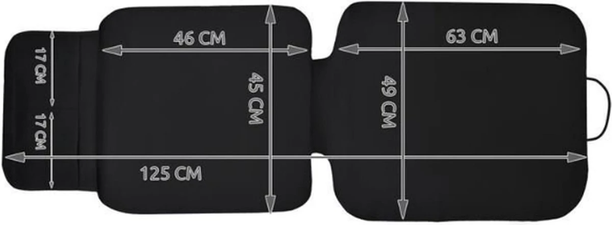 • SPECIFICATIE – totale afmetingen (lengte / breedte): 125/49, kussenafmetingen (lengte / breedte): 46/45 cm, rugleuningafmetingen (lengte / breedte): 63/49 cm, gewicht: 240 g.