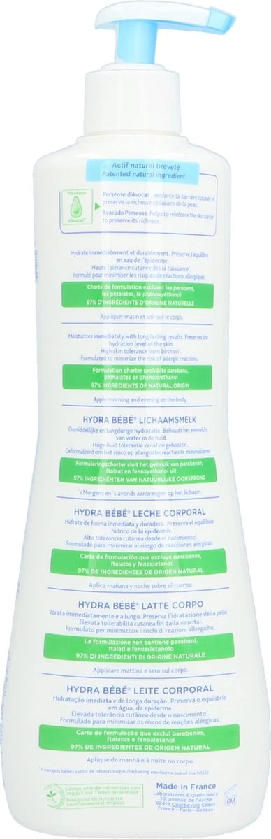 Mustela Hydra Bébé Lichaamsmelk is een hydraterende bodymilk voor de tere baby- en kinderhuid met 0% parabenen, 0% phtalaten en 0% phenoxyethanol.