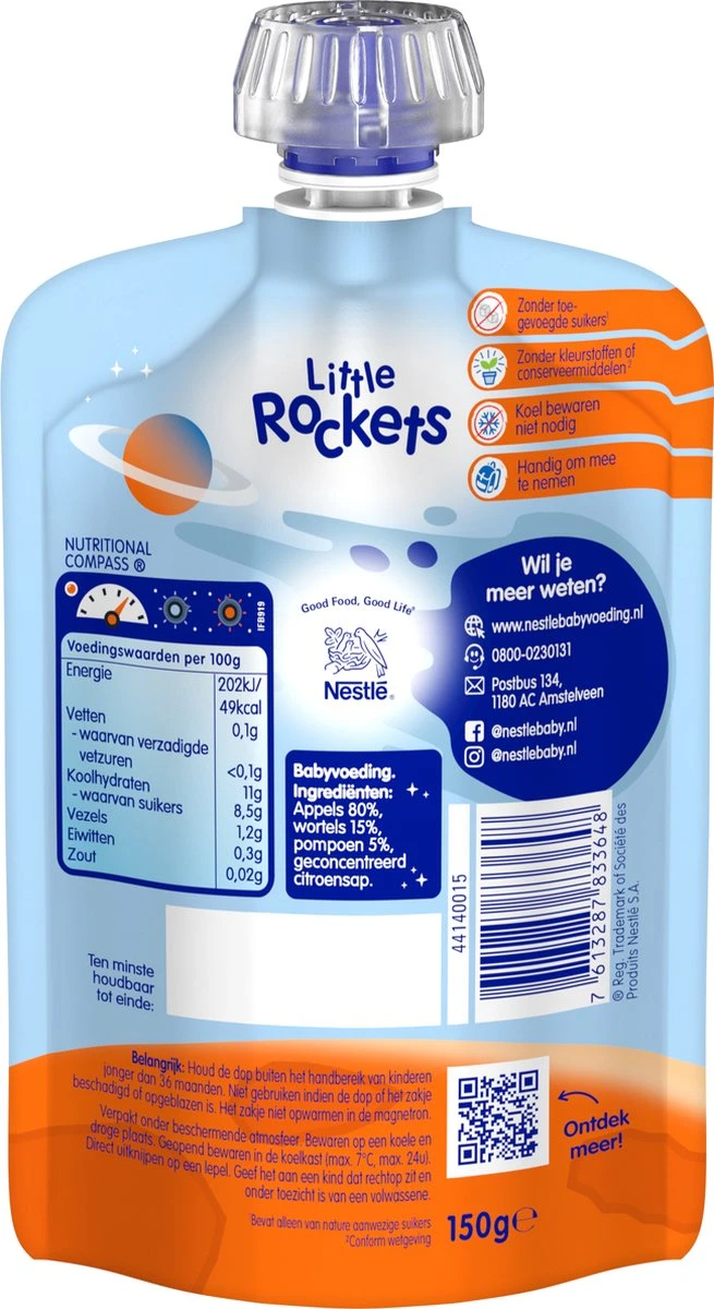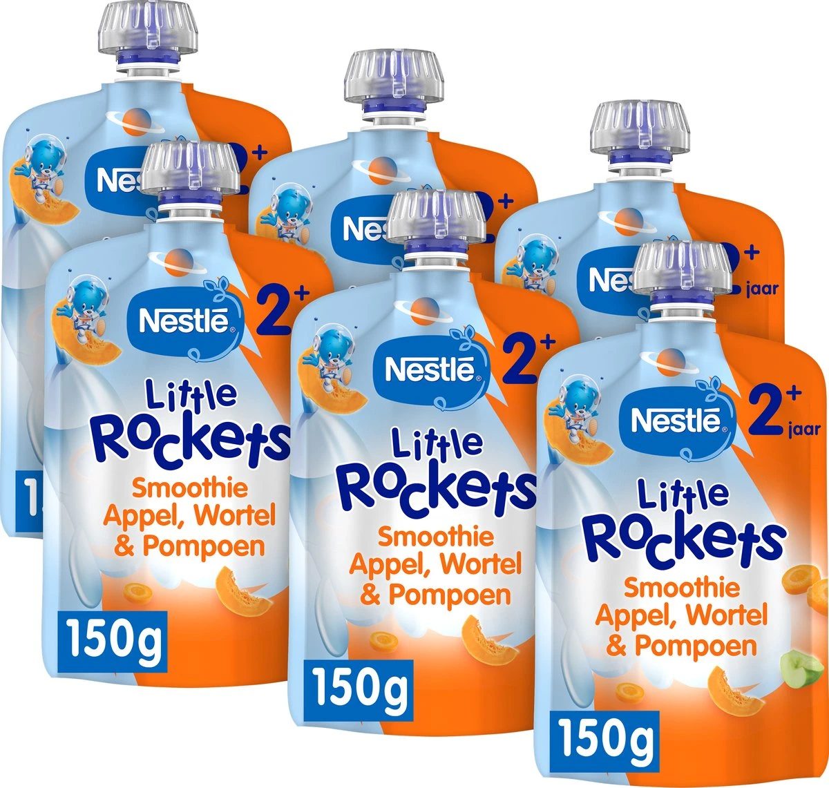 NESTLÉ Little Rockets Smoothie Appel, Wortel & Pompoen is een lekker tussendoortje speciaal afgestemd op jouw ontdekkende peuter. In een handig knijpzakje van 150g met alleen maar groente en fruit én zonder toegevoegde suikers*. Zo kan jouw peuter smullen, en door!