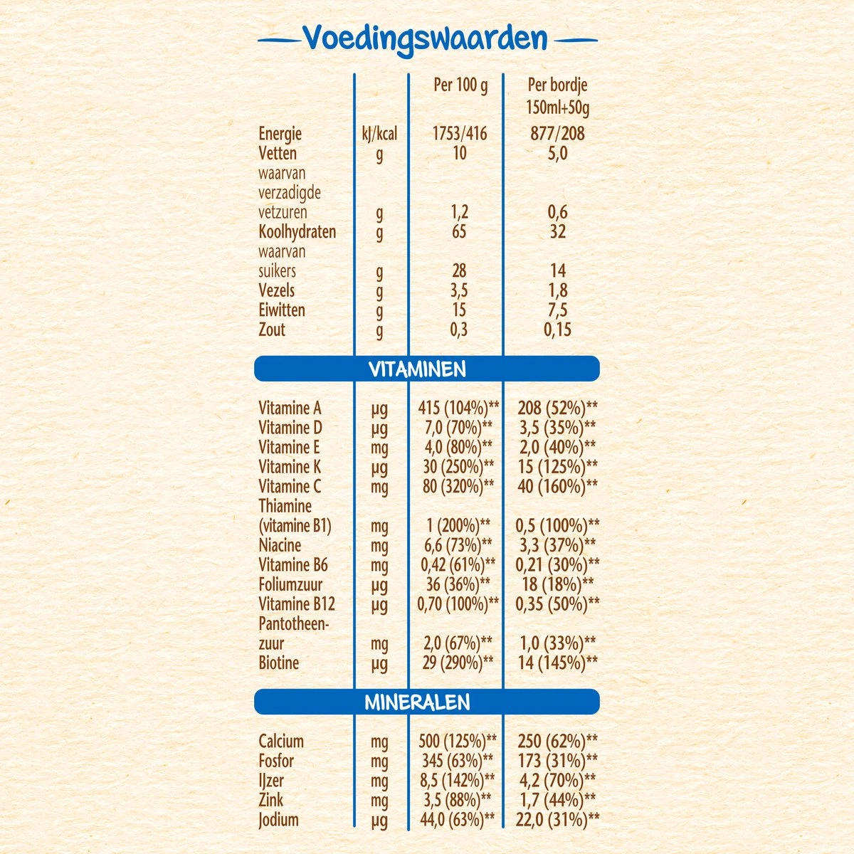 | Ingrediënten | Granen 50% (TARWEmeel, gehydrolyseerd TARWEmeel), magere MELKpoeder 23%, gedroogd fruit 14% (bananenvlokken 7%, sinaasappel 3%, ananasvlokken 2%, appelvlokken 1,1%, peervlokken 0,8%, maïszetmeel, emulgator: zonnebloemlecithine), plantaardige oliën (koolzaad, zonnebloem), volle MELKpoeder 5,2%, mineralen (calciumcarbonaat, ijzerfumaraat, zinksulfaat, kaliumjodide), vitaminen (C, niacine, E, B1, pantotheenzuur, A, B6, K, foliumzuur, biotine, D), aroma (vanilline), bifiduscultuur (B. lactis). |