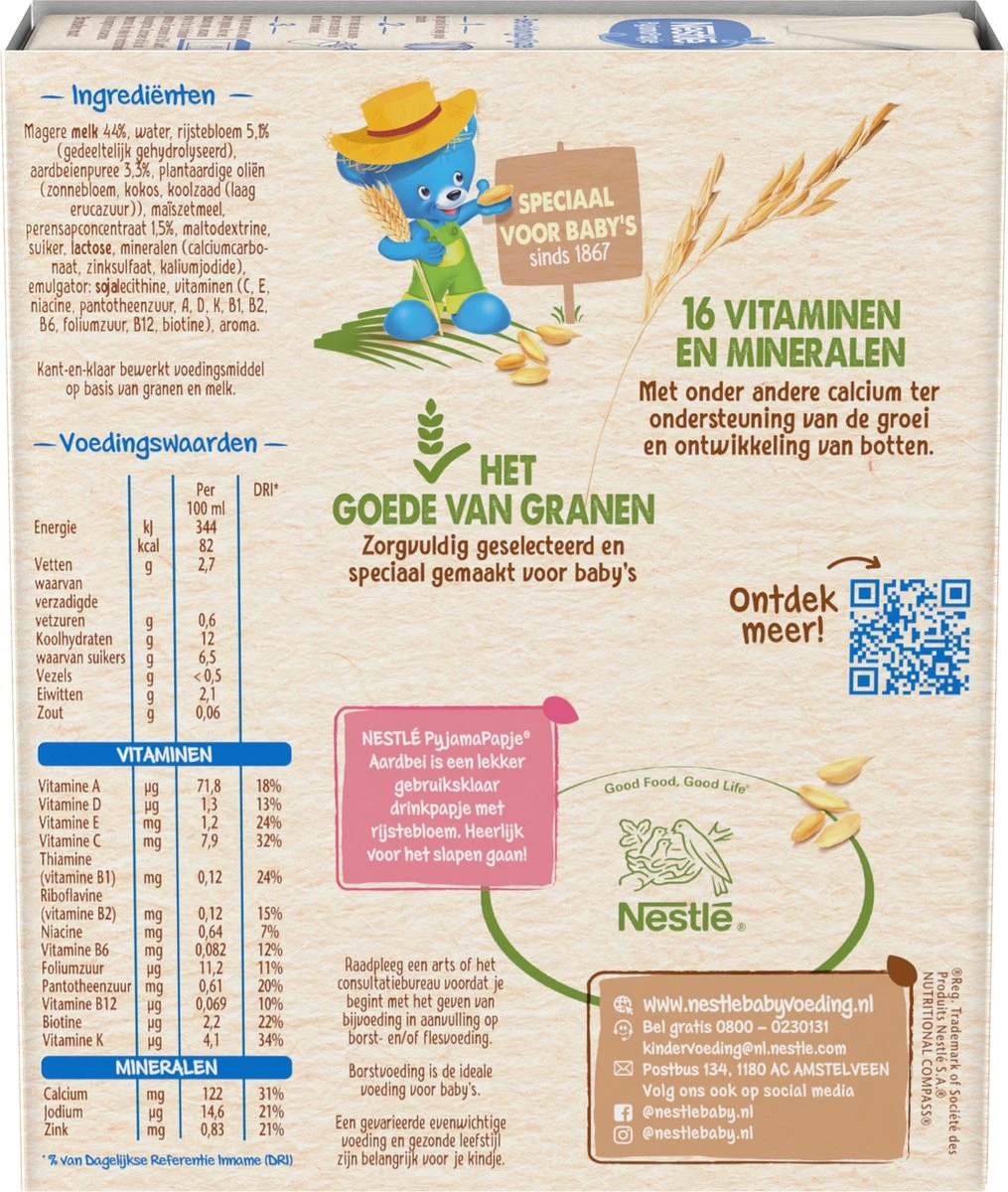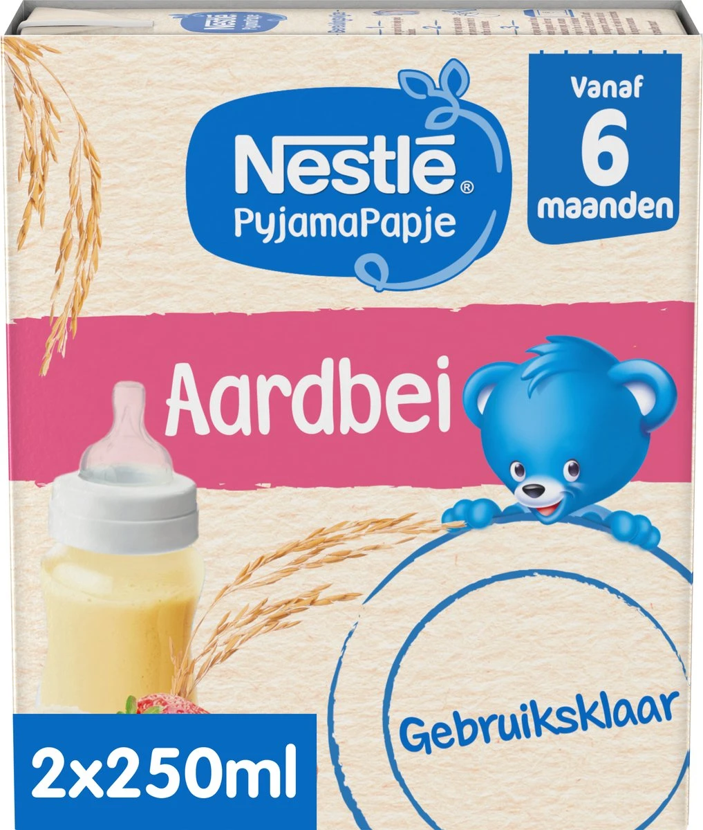 Nestlé PyjamaPapje® Aardbei is een lekker gebruiksklaar flessenpapje met rijstebloem. Het kan gegeven worden als variatie op een fles melk of een bordje pap. Lekker voor het slapen gaan.