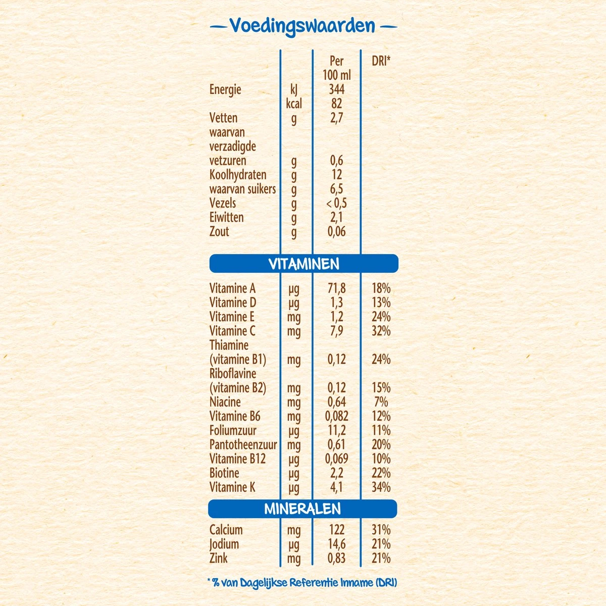 | Voedingswaarde | Soort Per 100 Milliliter. RI* Energie 344 kJ (82 kcal) Vet 2.7 g Waarvan verzadigd 0.6 g Koolhydraten 12 g Waarvan suikers 6.5 g Voedingsvezel 0.5 g Eiwitten 2.1 g Zout 0.06 g Calcium 122 mg 31% Jodium 14.6 µg 21% Zink 0.83 mg 21% Vitamine A 71.8 µg 18% Vitamine D 1.3 µg 13% Vitamine E 1.2 mg 24% Vitamine C 7.9 mg 32% Vitamine B1 / Thiamine 0.12 mg 24% Vitamine B2 / Riboflavine 0.12 mg 15% Vitamine B3 / Niacine 0.64 mg 7% Vitamine B6 / Pyridoxine 0.082 mg 12% Vitamine B11 / Foliumzuur 11.2 µg 11% Vitamine B5 / Pantotheenzuur 0.61 mg 20% Vitamine B12 / Cyano-cobalamine 0.069 µg 10% Vitamine H / Biotine 2.2 µg 22% Vitamine K 4.1 µg 34% *DRI*. |