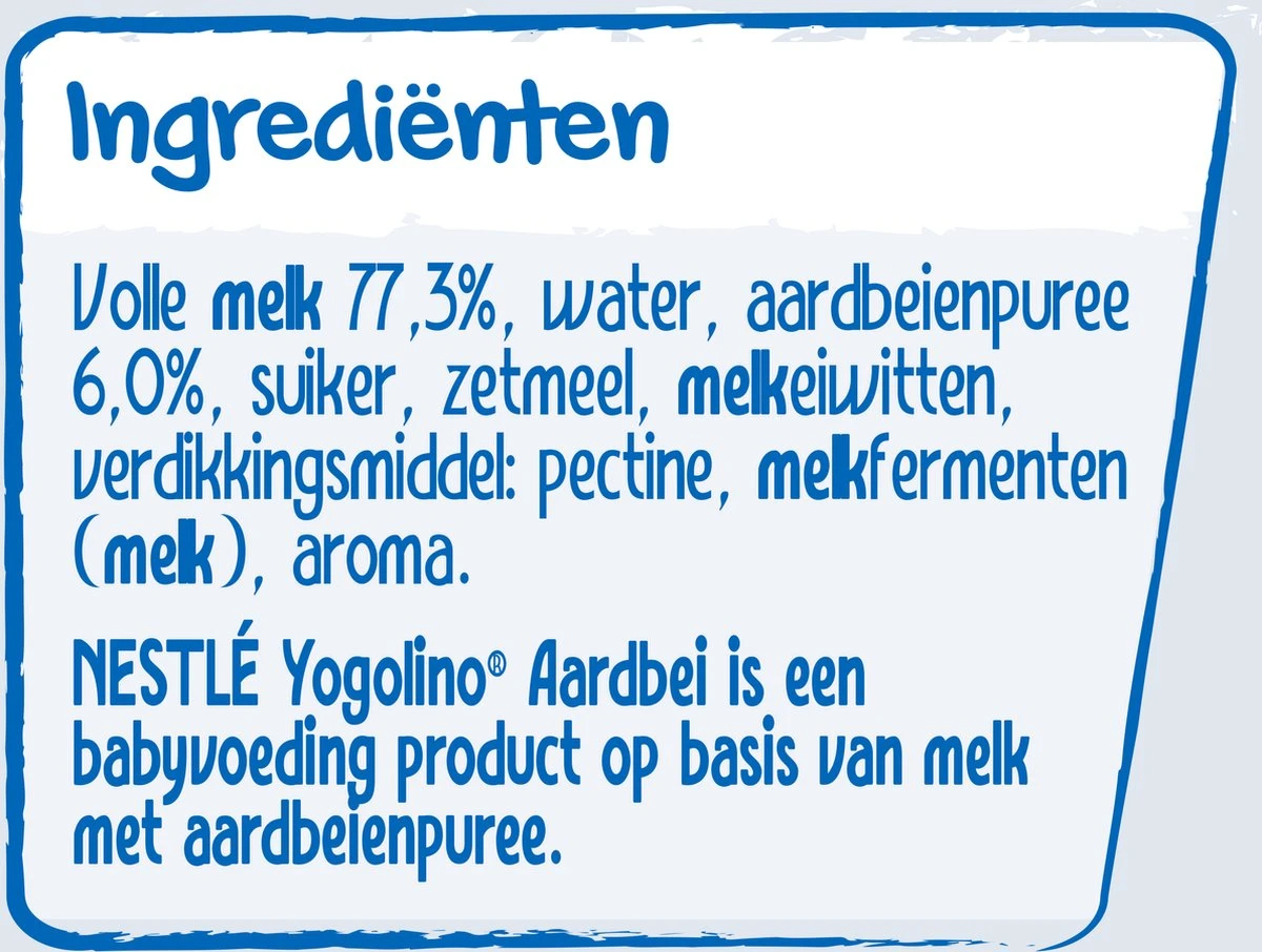 Nestlé Yogolino® is een babyvoeding product op basis van melk en aardbeienpuree (door warmtebehandeling langer houdbaar gemaakt) 3,1% vet in de melk. Nestlé Yogolino® is een verantwoord, heerlijk zacht zuivelhapje, bereid uit melk en fruit. Lekker als toetje of tussendoortje. Elk bekertje is een natuurlijke bron van calcium en is speciaal ontwikkeld voor kindjes van 6 tot 36 maanden.