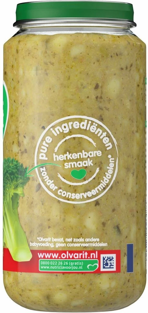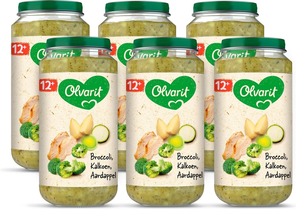 6-pack Olvarit Broccoli Kalkoen Aardappel, geschikt voor baby’s vanaf 1 jaar oud. Een babyhapje met een herkenbare smaak & textuur dat bijdraagt aan de smaakontwikkeling.