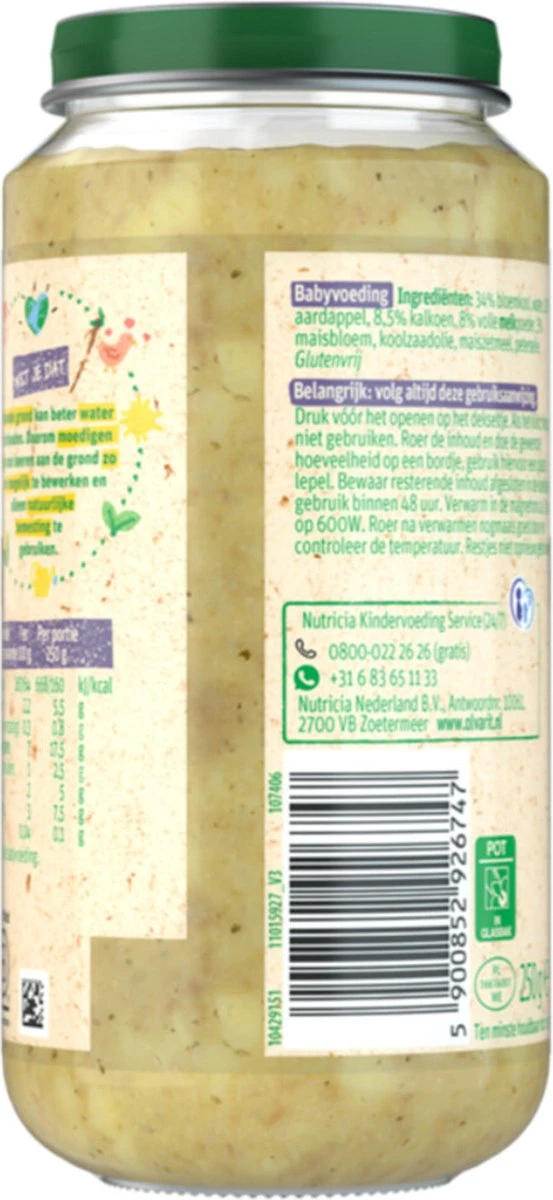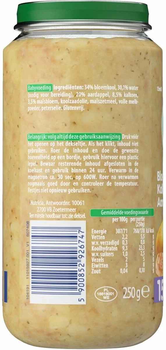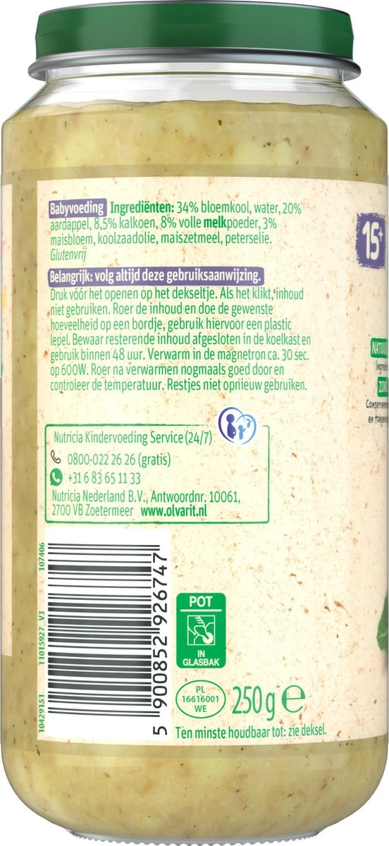 6-pack Olvarit Bloemkool Kalkoen Aardappel, geschikt voor baby’s vanaf 15 maanden oud. Een babyhapje met een herkenbare smaak & textuur dat bijdraagt aan de smaakontwikkeling.