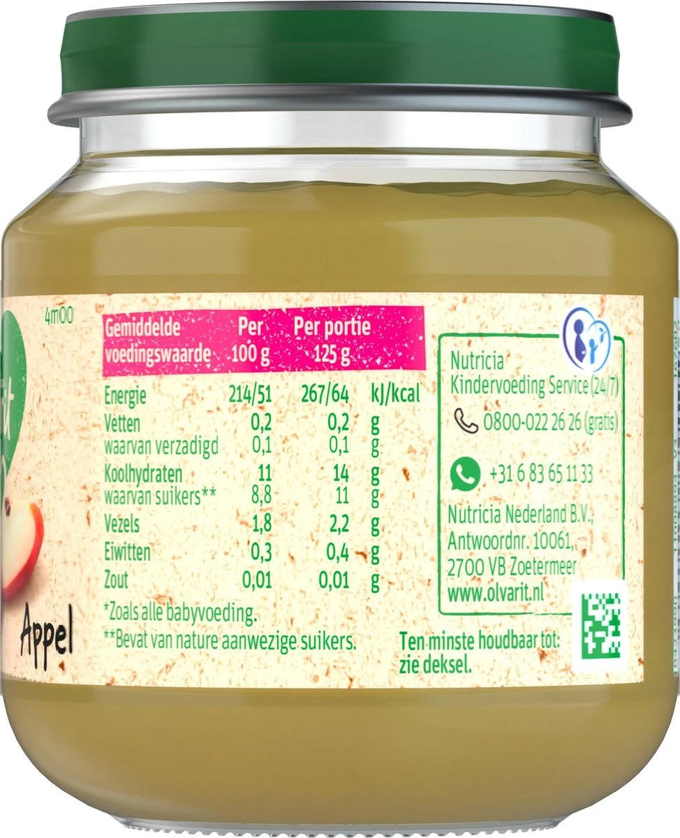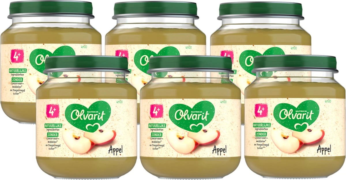 6-pack Olvarit Fruithapjes Appel, geschikt voor baby’s van 4 tot 6 maanden oud.