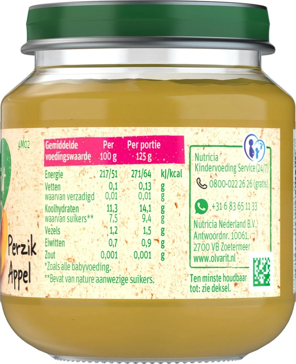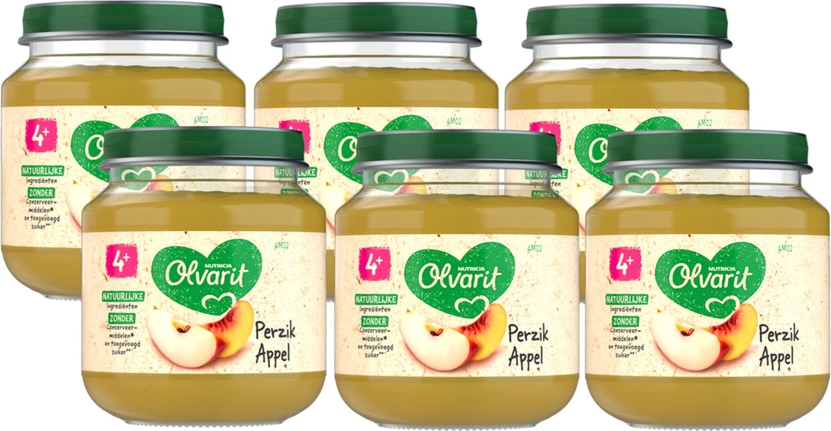 6-pack Olvarit Fruithapjes Perzik Appel, geschikt voor baby’s van 4 tot 6 maanden oud.