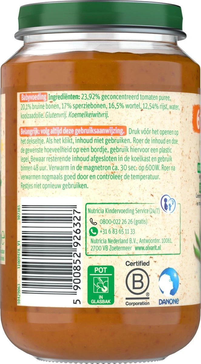 6-pack Olvarit Maaltijdhapjes Vegetarische Bruine Bonenschotel geschikt voor baby’s van 6 tot 8 maanden oud. Een babyhapje met een herkenbare smaak & textuur dat bijdraagt aan de smaakontwikkeling.