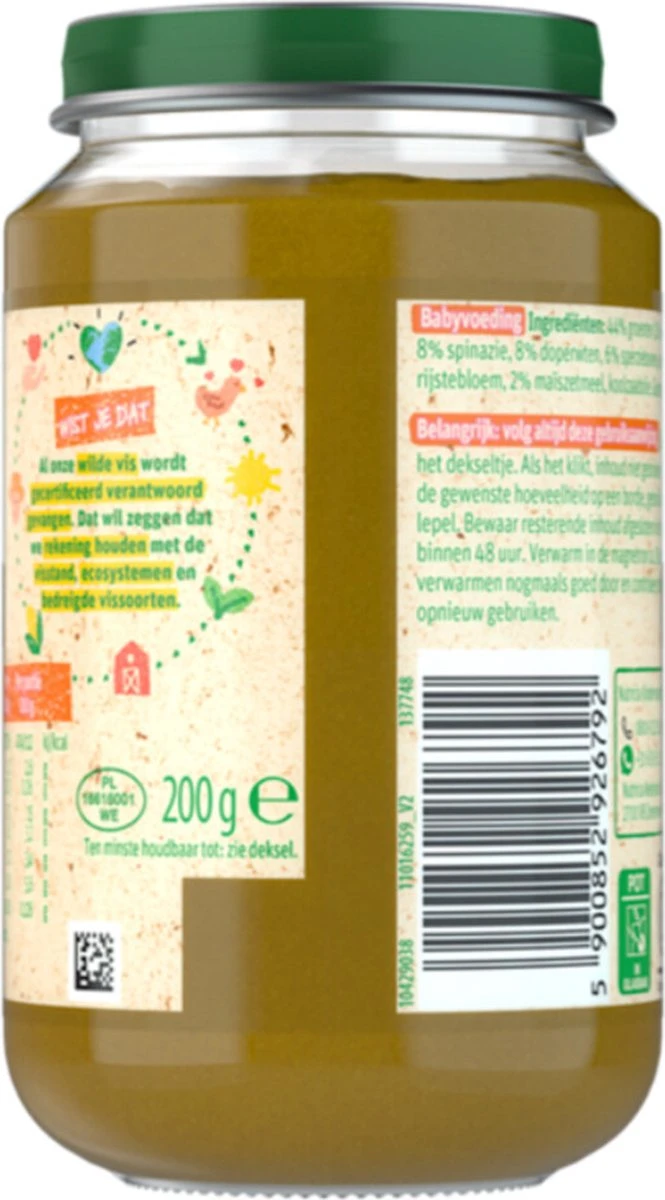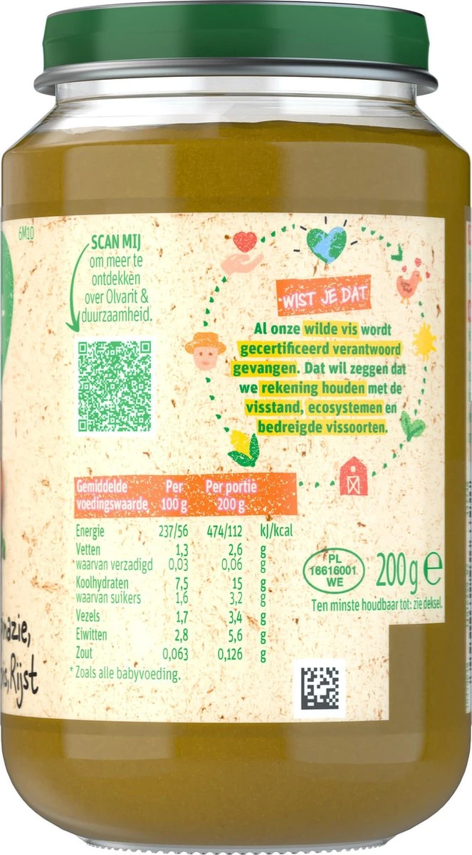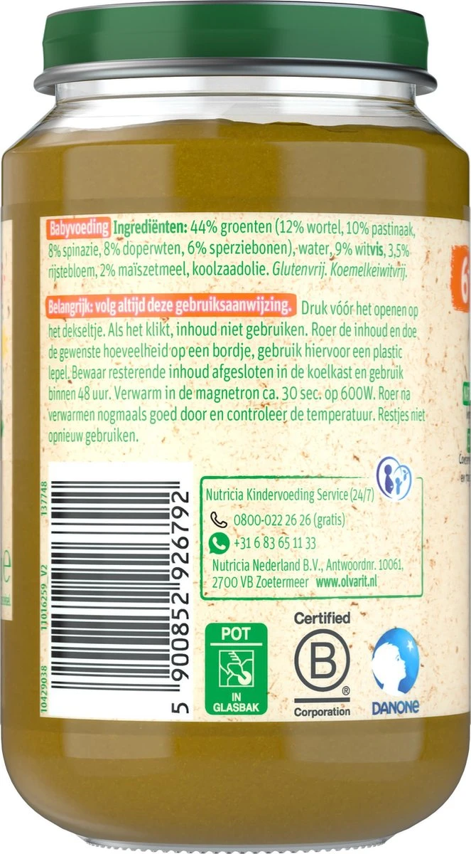 6-pack Olvarit Maaltijdhapjes Spinazie Witvis Rijst, geschikt voor baby’s van 6 tot 8 maanden oud.