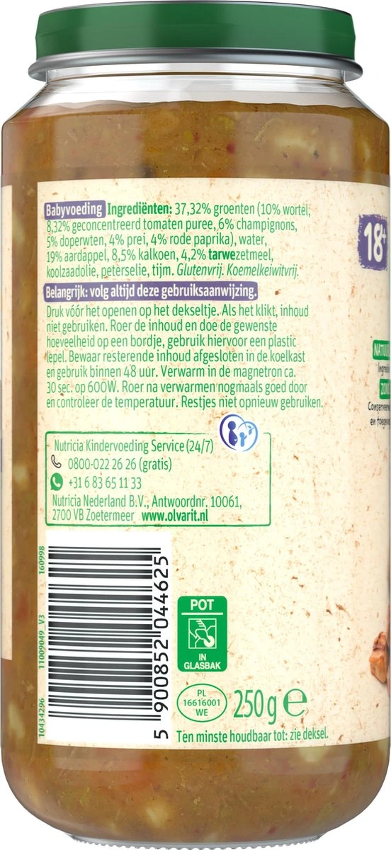 6-pack Olvarit Maaltijdhapjes Stamppot Wortel Kalkoen, geschikt voor baby’s vanaf 18 maanden oud. Een babyhapje met een herkenbare smaak & textuur dat bijdraagt aan de smaakontwikkeling.