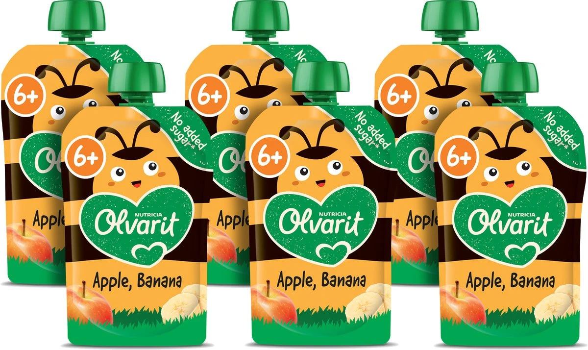 Olvarit Knijpfruit Appel Banaan, geschikt voor baby’s vanaf 6 maanden oud.