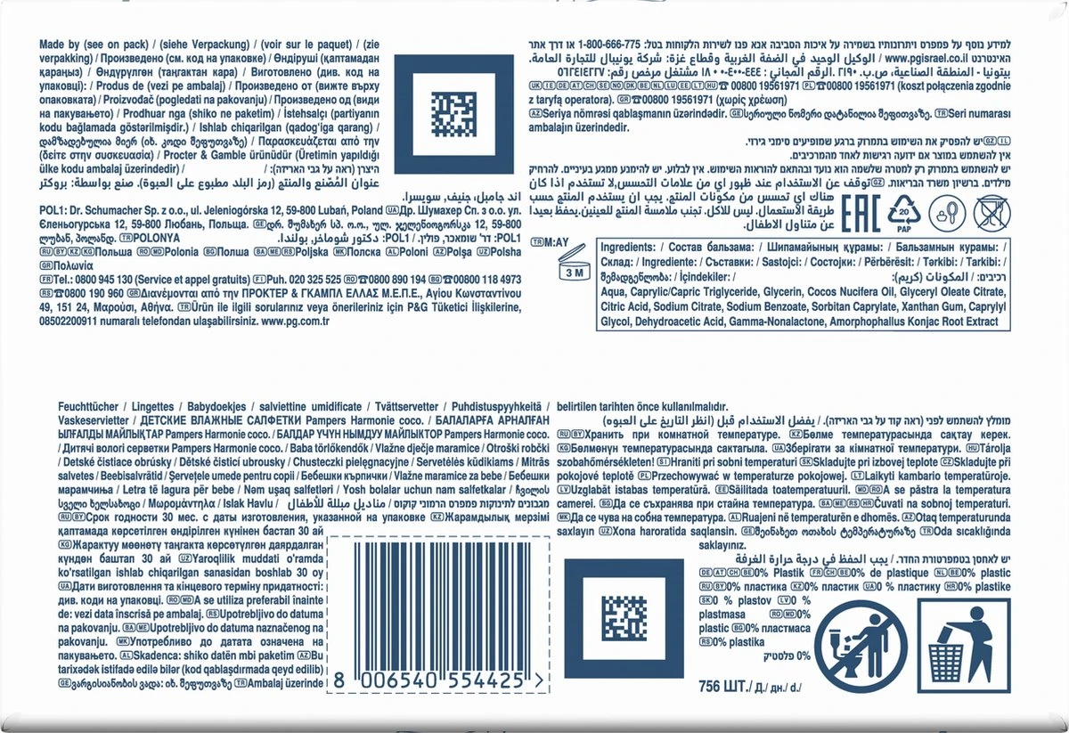 De huid van je baby is erg gevoelig en moet zacht gereinigd worden, ook de meest gevoelige lichaamsdelen zoals de billetjes. Pampers Harmonie Coco babydoekjes bevatten biologische kokosolie om de gevoelige huid van je baby te hydrateren en beschermen. Ze bevatten 0% plastic, en zijn uitsluitend gemaakt met 100% plantaardige vezels. De enzymen in plas en poep veranderen de pH van de huid, waardoor het risico op irritatie en huiduitslag verhoogt. De unieke formule van de Pampers Harmonie Coco is dermatologisch getest en beschermt de natuurlijke pH-waarde van de huid beter dan katoen en water, waardoor het risico op huidirritatie vermindert. Pampers Harmonie Coco zijn speciaal ontworpen voor de gevoelige huid van pasgeboren baby’s. Ze bevatten geen alcohol, kleurstoffen.