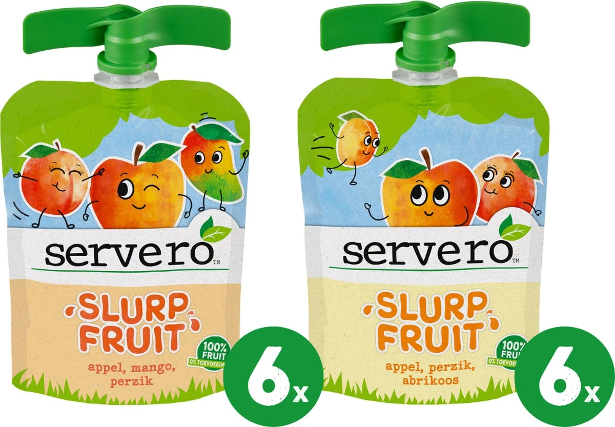 Servero Slurpfruit 100% Fruit is er in twee heerlijke smaken die samen in een mixpack verpakt worden. We kiezen voor herkenbare fruitsoorten en pureren die tot een lekkere gladde fruitmoes, omdat kinderen dat lekker vinden. Iedere smaak bestaat uit verschillende soorten fruit;