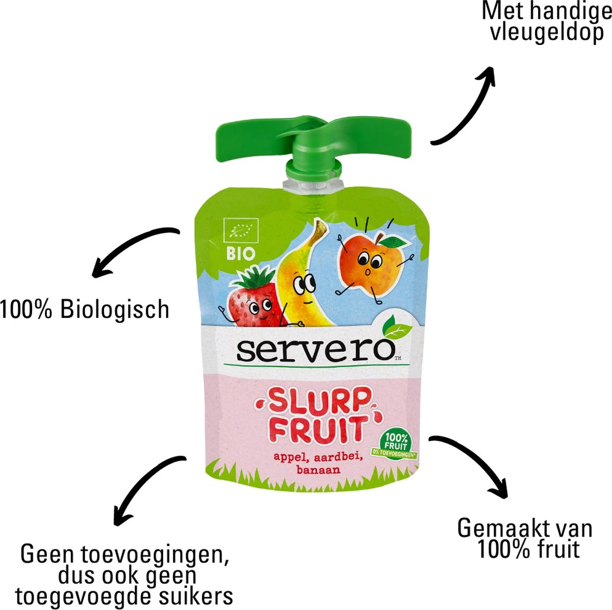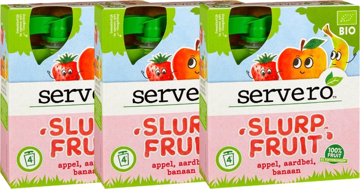 Servero Slurpfruit is een verantwoord fruit tussendoortje. Deze fruitsnack is gemaakt van 100% Biologisch fruit zonder toevoegingen. Het knijpzakje is ideaal voor onderweg.