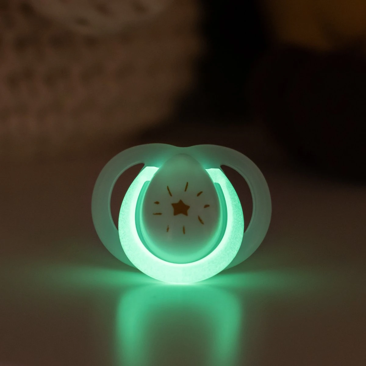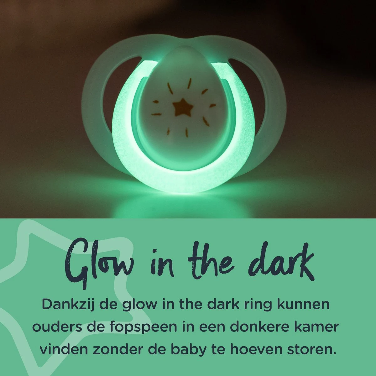- Glow in the dark ring: dankzij de glow in the dark ring kunnen ouders de fopspeen in een donkere kamer vinden zonder dat zij de baby hoeven te storen