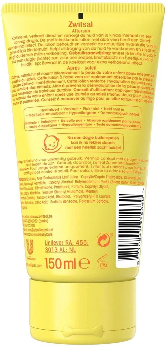 Zwitsal Na ’t Zonnetje Aftersun Lotion kalmeert, verkoelt direct en verzorgt de huid van je kindje intensief na een zonnig dagje. Het product is verrijkt met aloë vera voor een direct kalmerend effect. De snel intrekkende lotion behoudt en versterkt de natuurlijke hydratatie van de (gevoelige) kinderhuid. Helpt uitdroging van de huid te voorkomen en biedt langblijvende milde verkoeling. Smeer na een dagje (lichte) zon je kindje royaal in voor een soepel, knuffelzacht én heerlijk ruikend huidje. Tip: bewaar in de koelkast voor extra verkoelend effect.